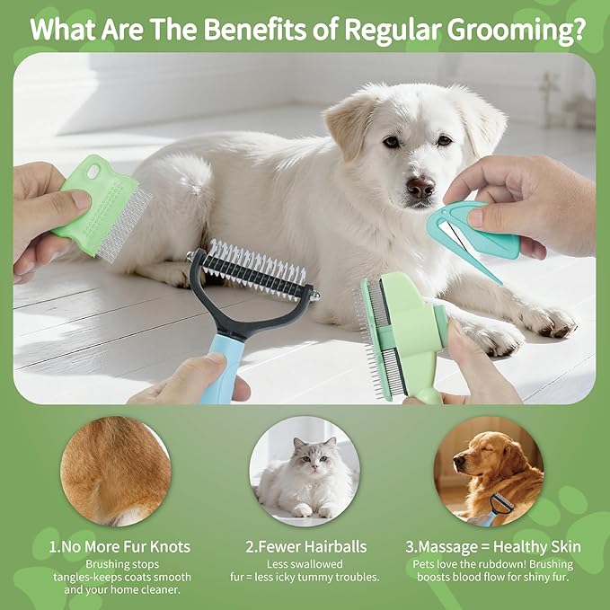 - PROMOTES HEALTHY, SHINY FUR: Suitable for all fur types (short, long, curly, or straight), regular combing and massaging with this set boosts your pet’s blood circulation, calms their mood, and eliminates loose, dead fur. Over time, this maintains a smooth, lustrous coat and prevents dullness or tangles.
