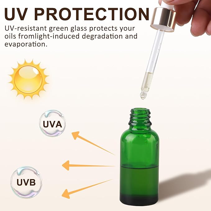 - PROTECTIVE DESIGN: Dark green glass construction shields light-sensitive liquids from spoilage, while built-in cap and glass dropper enable precise, controlled dispensing