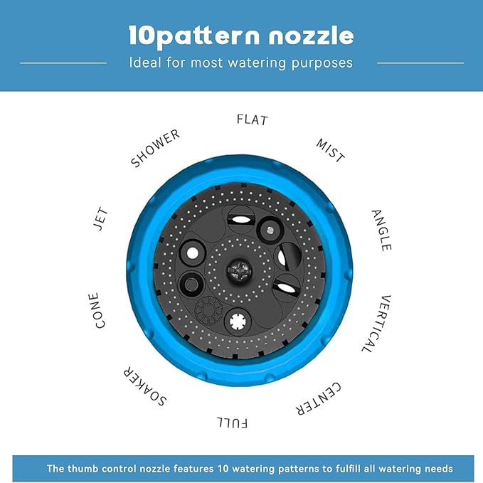 - ★【10-in-1 Versatile Spray Patterns】Take on any task with precision. Easily switch between 10 specialized settings, Mist, Shower, Cone, Flat, Jet, Center, Soaker, Angle, Full, and Vertical. From gently watering delicate seedlings to power-washing your driveway, this single nozzle meets all your needs for gardening, car washing, pet bathing, and household cleaning.