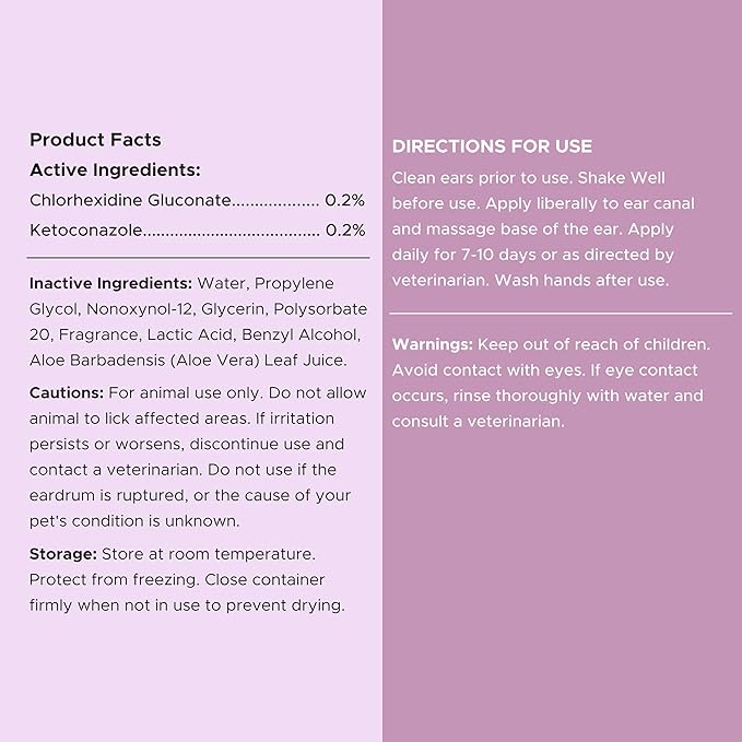 - When using the ear wash for dogs, clean the ears prior to use and shake the bottle well. Apply liberally to the ear canal and massage the base of the ear. Apply daily for 7-10 days or as directed by your vet. Wash your hands after use.