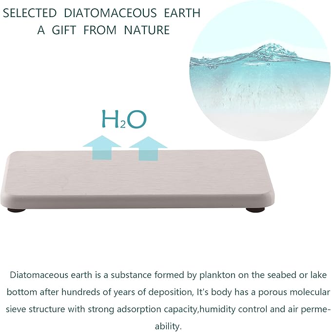 - Made from natural Diatom mud and plant fiber, small holes within diatomite enable it have amazing water absorption. They could absorb water and gets dry in a few minutes. It makes the Bathroom Counter top more dry and tidy.
