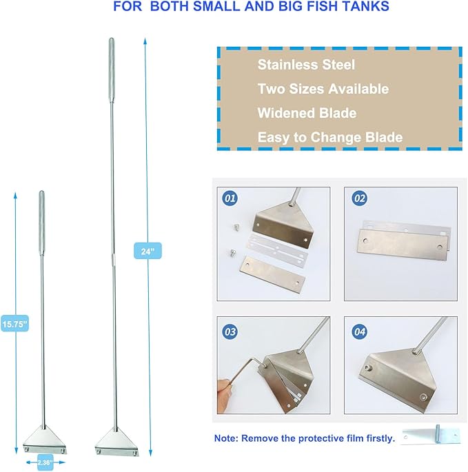 - ADJUSTABLE LENGTH(15.7 INCH/25.2 INCH) + 2.48 INCH WIDE BLADE HEAD: The glass scraper has 2 length options: 15.7" for small/medium tanks and 25.2" for deep/large ones (20-40 gallon), reaching every corner without wet hands. It also has a widened 2.48" blade head—larger than standard scrapers—covering more glass per swipe to speed up cleaning.