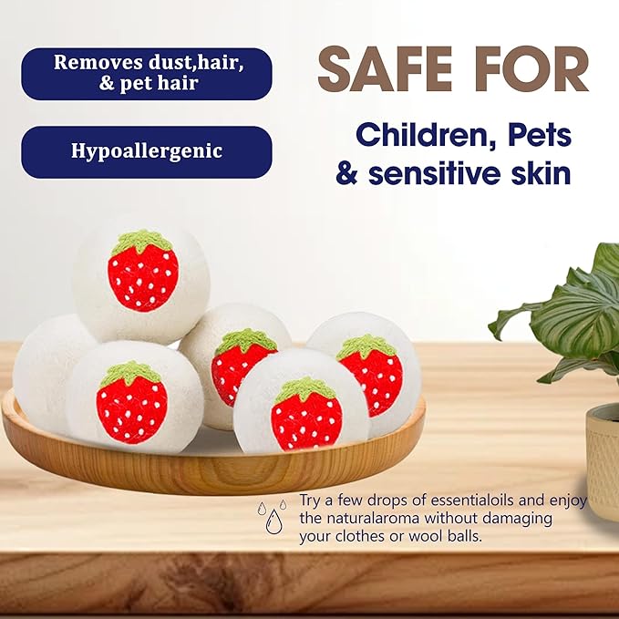 - 🍓Most laundry balls and plastic dryer balls release harmful ingredients into the home and environment. These dryer laundry balls do not contain any harsh ingredients or fragrances. They contain only - you guessed it - wool! These dryer balls gently fluff clothing fibers to keep sheets, towels, and clothing naturally soft with fewer wrinkles.