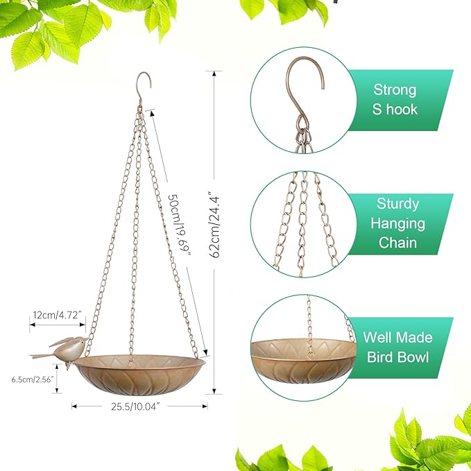- Durable Structure: This metal bird bath is made of high-quality materials and has an anti-rust spray process on the outer layer. It is beautiful, durable, not easy to deform and break, and suitable for all climate environments. The three-point chain structure ensures balanced weight distribution, prevents tilting and tipping, and provides a stable standing platform for birds to come to drink water and bathe.
