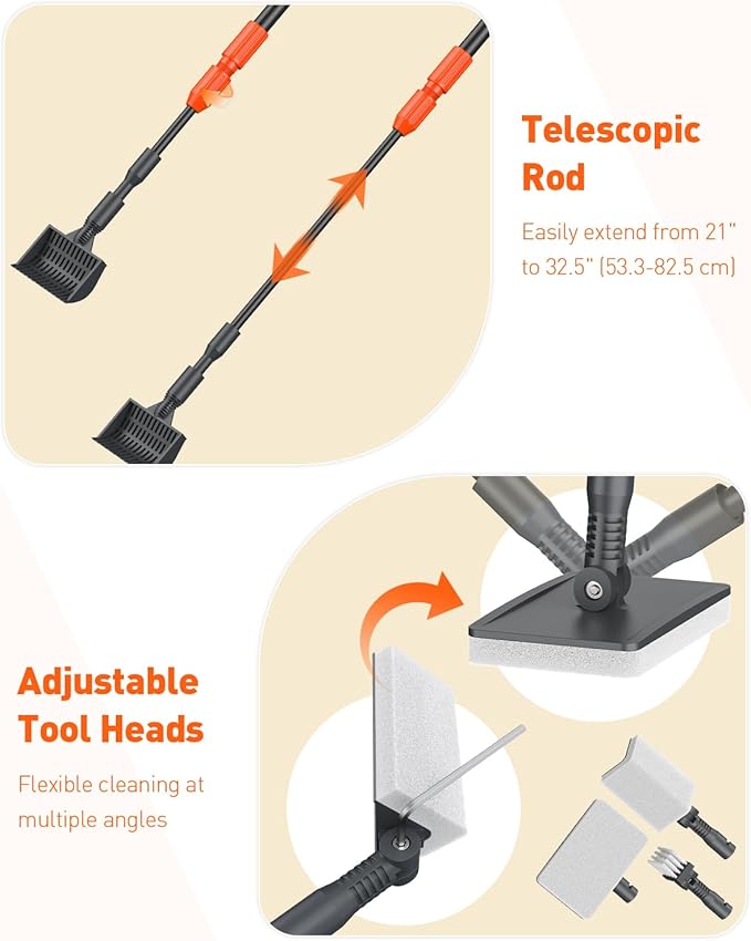 - Easy to Set Up & Extend: Align the spring bulge with the arrow on any tool and turn it sideways to snap it into place. Twist the locking sleeve to extend the rod from 21" to 32.5" effortlessly, reaching deep into the tank without getting your hands wet