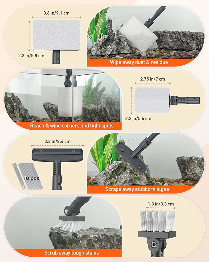 - Cleaning Pads & Brushes: The 2 sponge pads gently wipe away dust and residue, easily reaching corners and tight spots for a spotless finish. The square and tube brushes quickly scrub away tough stains inside the tank or narrow tubes (3/5" diameter)