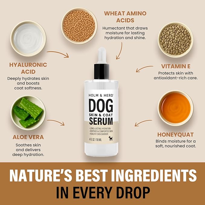 - Moisturizing Skin & Coat Serum – Plant-based oils nourish, protect, and restore shine, keeping your dog’s coat healthy and smooth during the dry winter season.