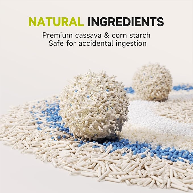 - Superior Absorption and Odor Control - Cassava starch and SAP ensure excellent absorption, while baking soda neutralizes odors, effectively reducing smells from urine and feces. Extend the use of cat litter.