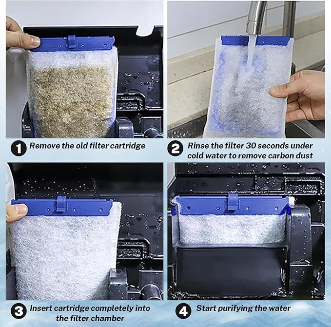 - Simple Operation, Ready-to-Use: Each filter cartridge is pre-assembled at the factory. Users simply rinse for 30 seconds before use. Replacement is effortless and requires no additional tools. For optimal filtration performance, we recommend replacing every 2-4 weeks (frequency may vary depending on tank density)