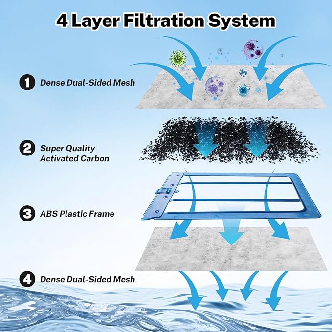 - 3 Layer Filtration for Clearer Water: Features a double-sided filter mesh structure that efficiently captures fish waste, food particles, and suspended debris. The built-in activated carbon layer adsorbs odors, impurities, and discoloration-causing chemicals, helping maintain pH balance and ensuring long-lasting water clarity